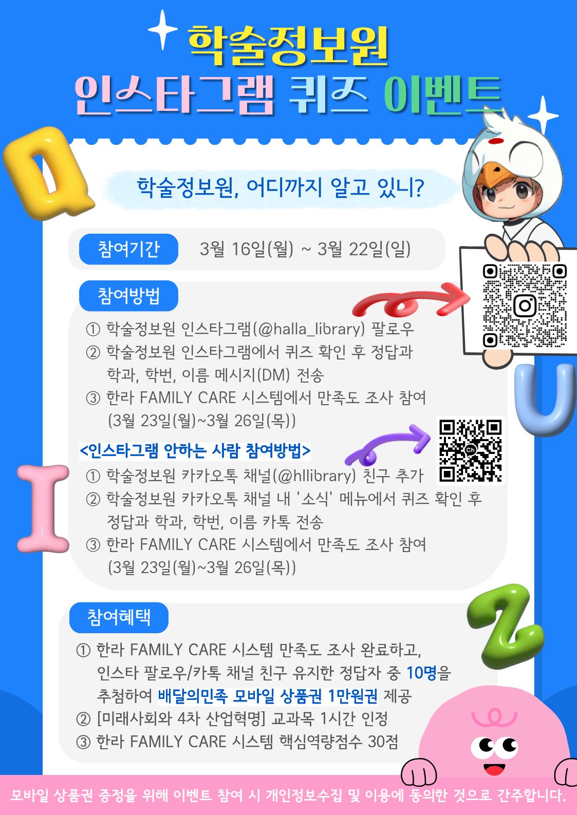 - 인스타그램 안하는 경우: 학술정보원 카카오톡 채널(@hllibrary) 친구 추가하기